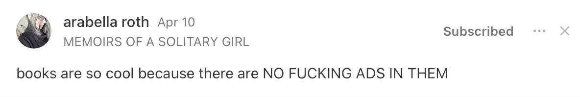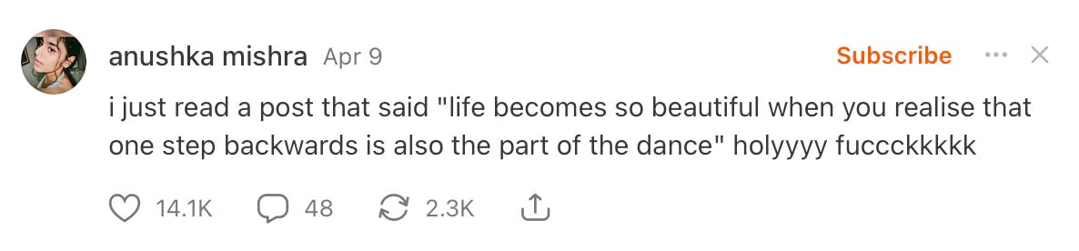 Substack is doing a lot at once, newsletter, podcast portal, community. But the Notes section is giving me something close to what Twitter gave me and I’m here for it. It’s slightly giving Threads but I’m ok with it.