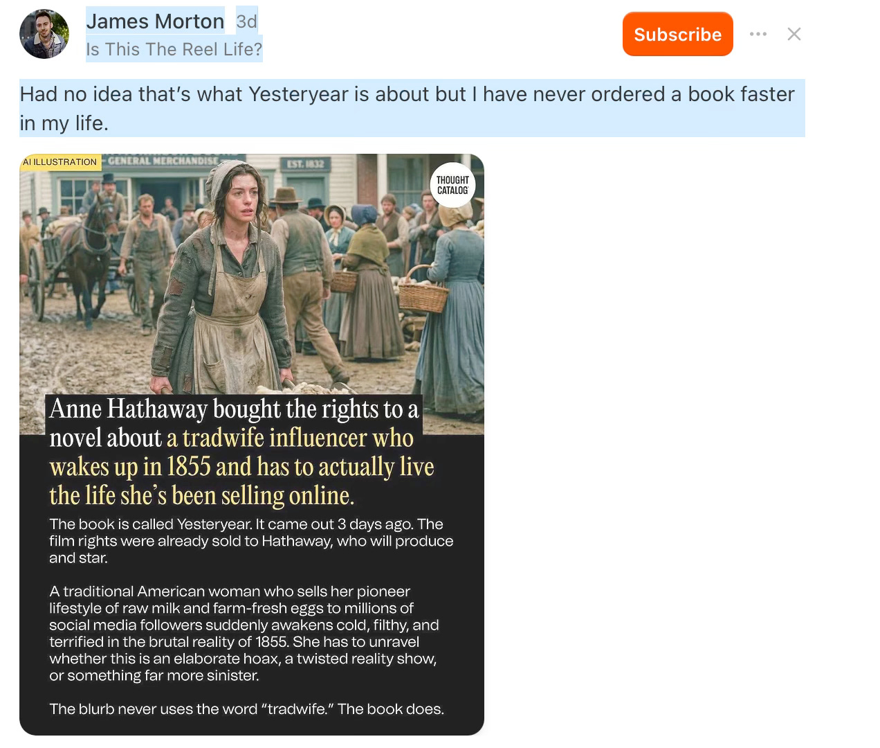 Books I need to read now that I saw this news. A tradwife influencer wakes up in 1805. I have never ordered a book faster. It’s called Yesteryear. Yesteryear