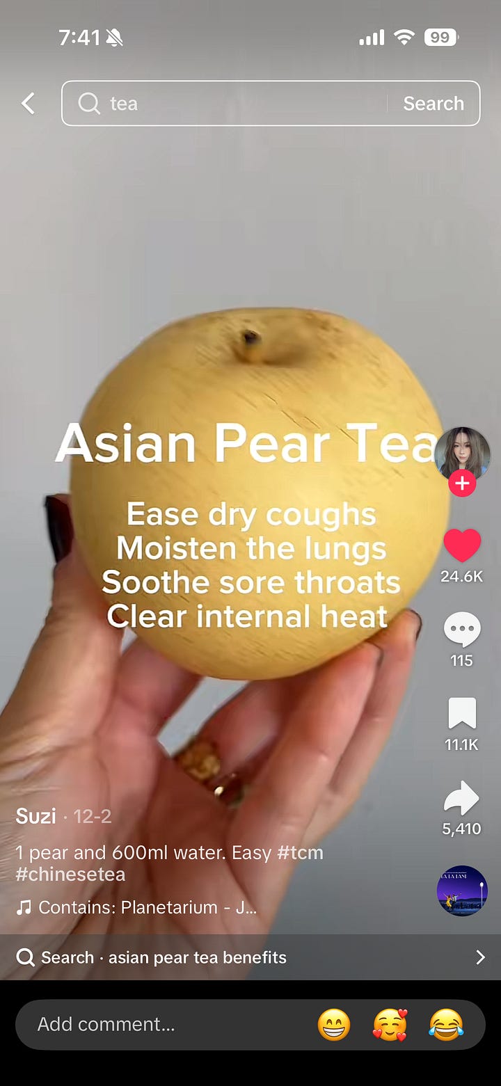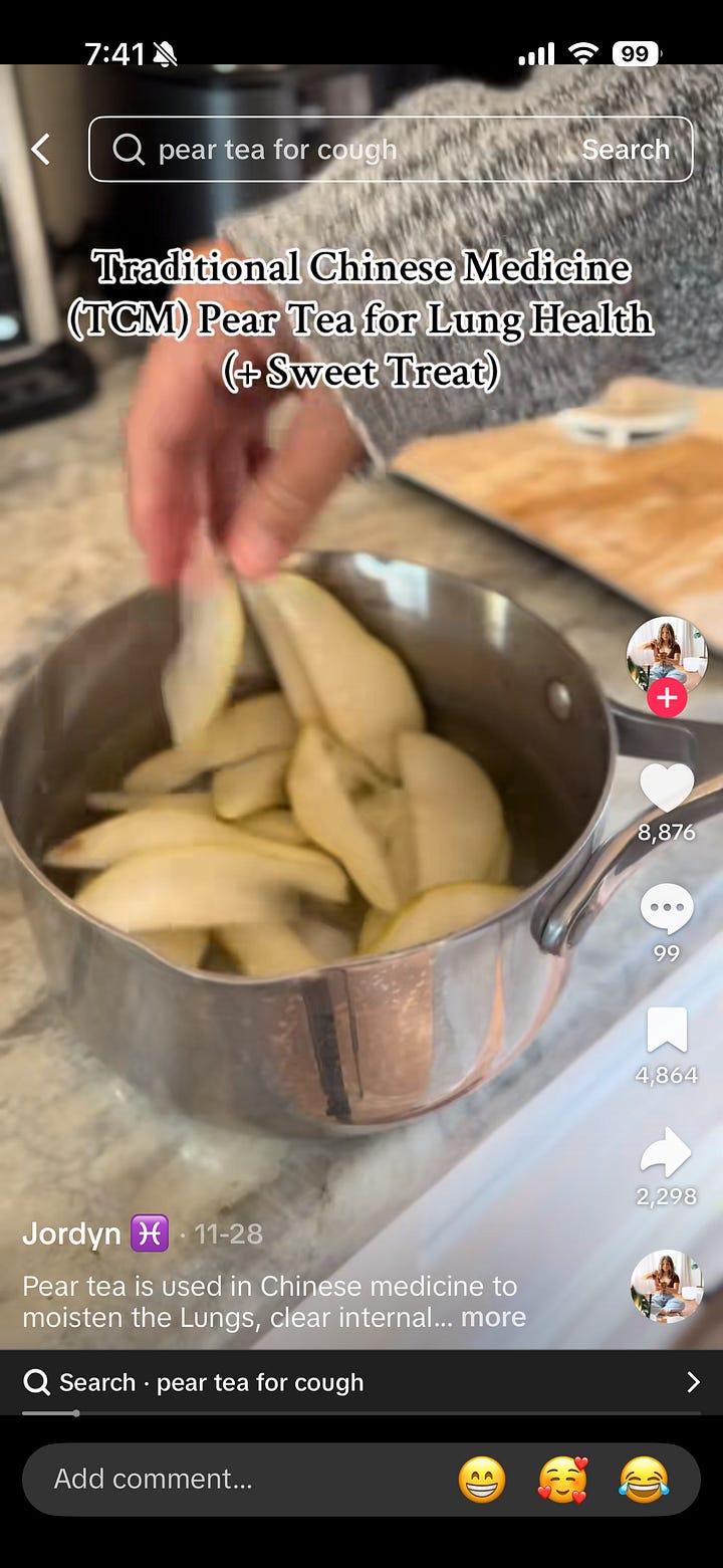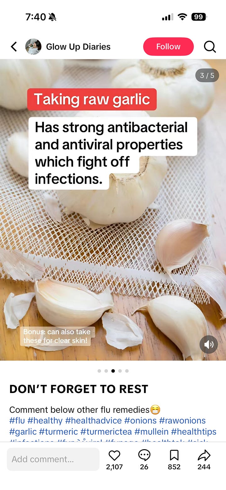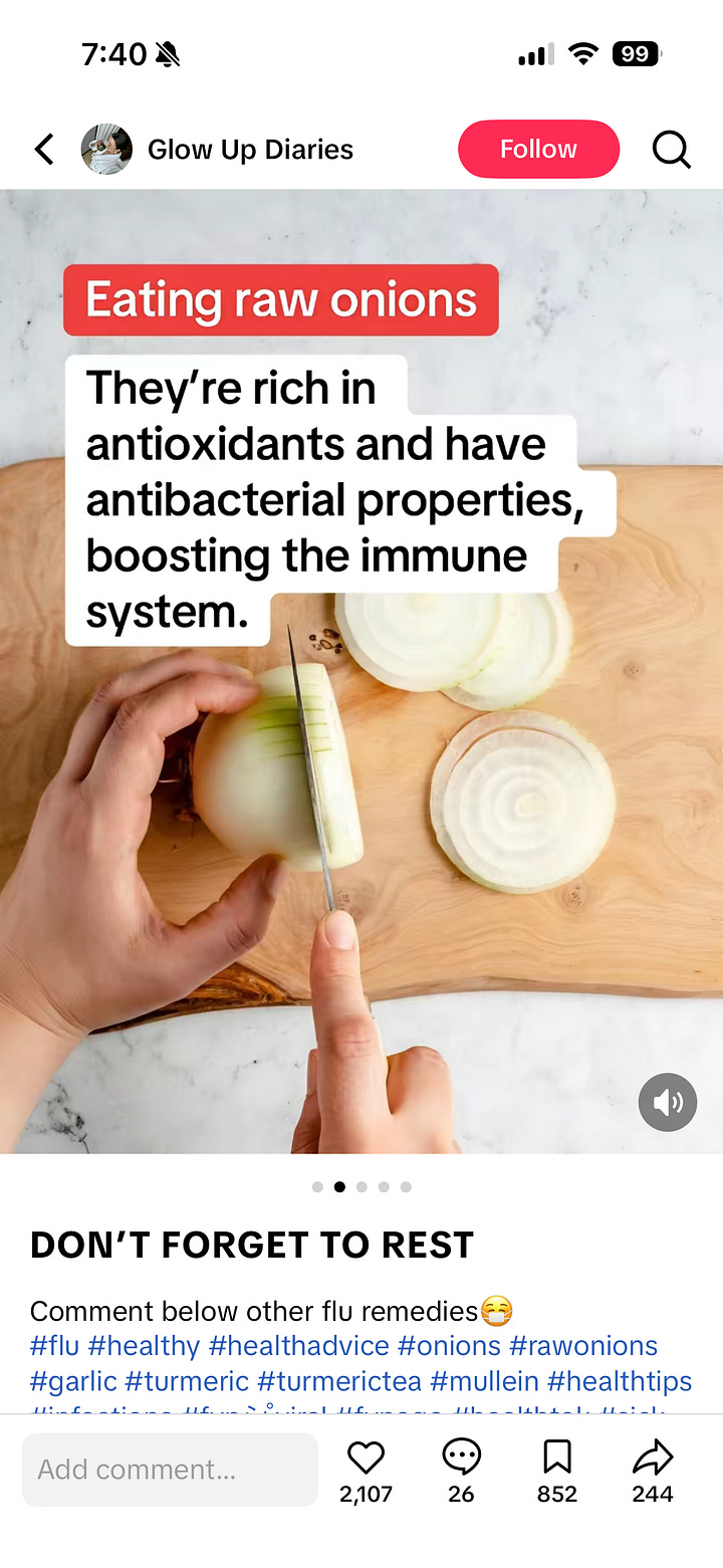 I also fell straight into TikTok Remedy Culture. The algorithm, generous and unhinged, offered me boiled pears from Chinese medicine experts and mothers. Raw garlic. So many versions of raw garlic. Eating raw onions for immunity and punishment. Gargling salt water. Soaking your feet in salt water. Steam, but not too much steam. Sauna yes. Sauna no. Zinc, but never on an empty stomach unless you want to spiral harder. And a viral drink called a “flu bomb” by Barbara O’Neill, which involved ginger, garlic, lemon, honey, and fear. No idea who this woman is, but here is her viral recipe:
