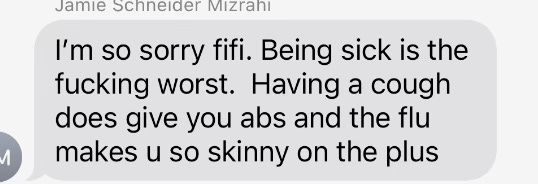 When my other best friend, Lolo, texted me that she had the same thing on a family vacation and was hysterically crying, I felt less insane. I wasn’t alone in it. I wasn’t uniquely weak. We were both being flu babies and we couldn’t bypass this part.