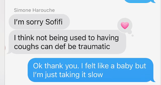 But again, I’m from California, and I’ve barely even had a cold. I’m not like these East Coasters who grew up with the kind of colds you take antibiotics for. I’ve never even taken an antibiotic. This isn’t bragging. This is context. Every symptom felt like a mental threat to my sanity. I found myself texting my group chat constantly for sympathy for each new symptom. It was all so new to me.